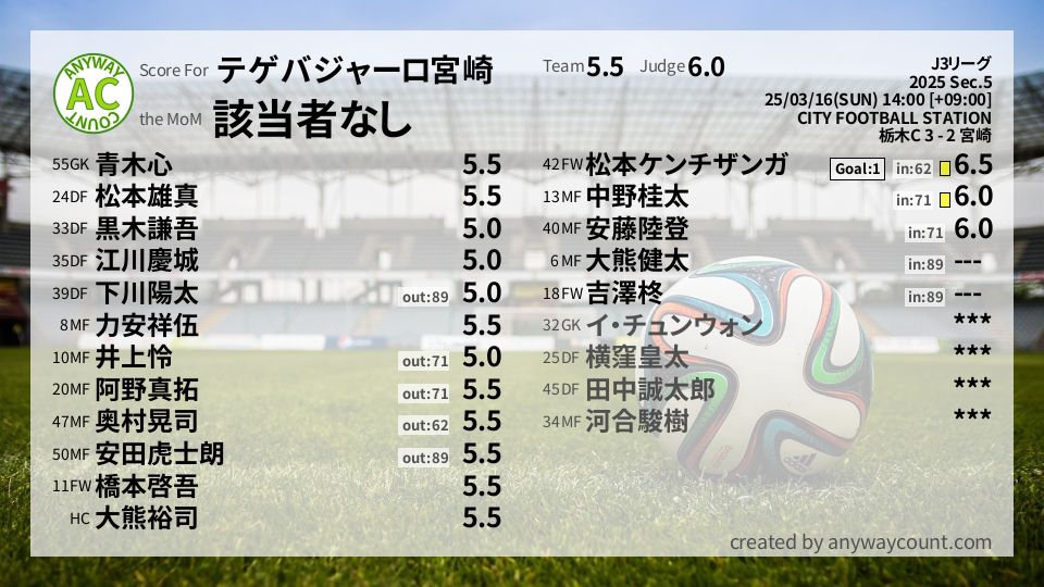 #テゲバジャーロ宮崎 #J3リーグ Sec.5採点