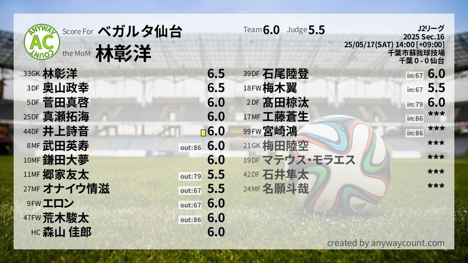 #ベガルタ仙台 #J2リーグ Sec.16採点
