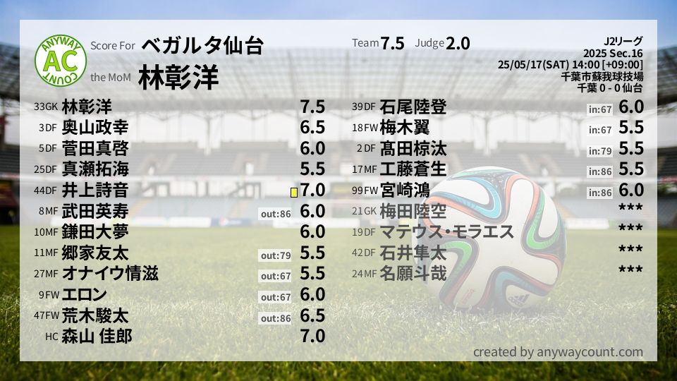 #ベガルタ仙台 #J2リーグ Sec.16採点