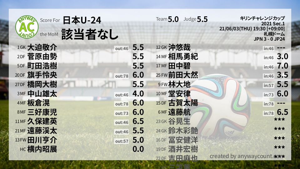 #日本U-24 #キリンチャレンジカップ Sec.1採点
