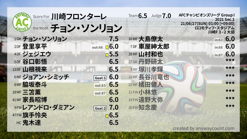 #川崎フロンターレ #AFCチャンピオンズリーグ Group I Sec.1採点