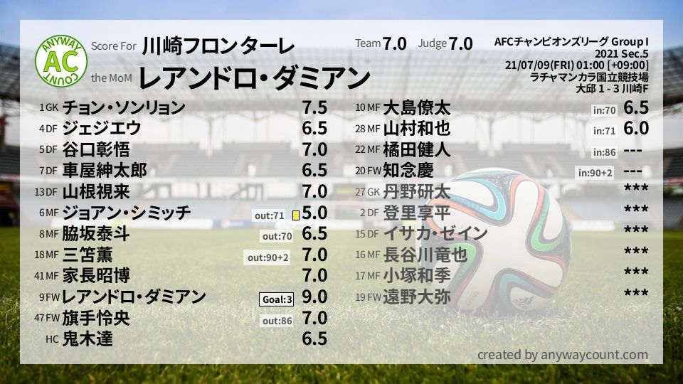 #川崎フロンターレ #AFCチャンピオンズリーグ Group I Sec.5採点