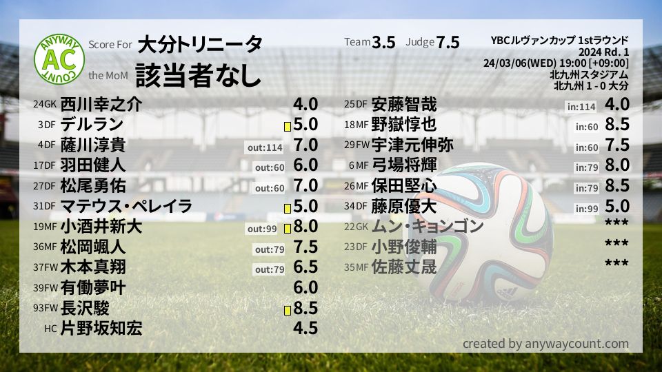 #大分トリニータ #YBCルヴァンカップ 1stラウンド Rd. 1採点